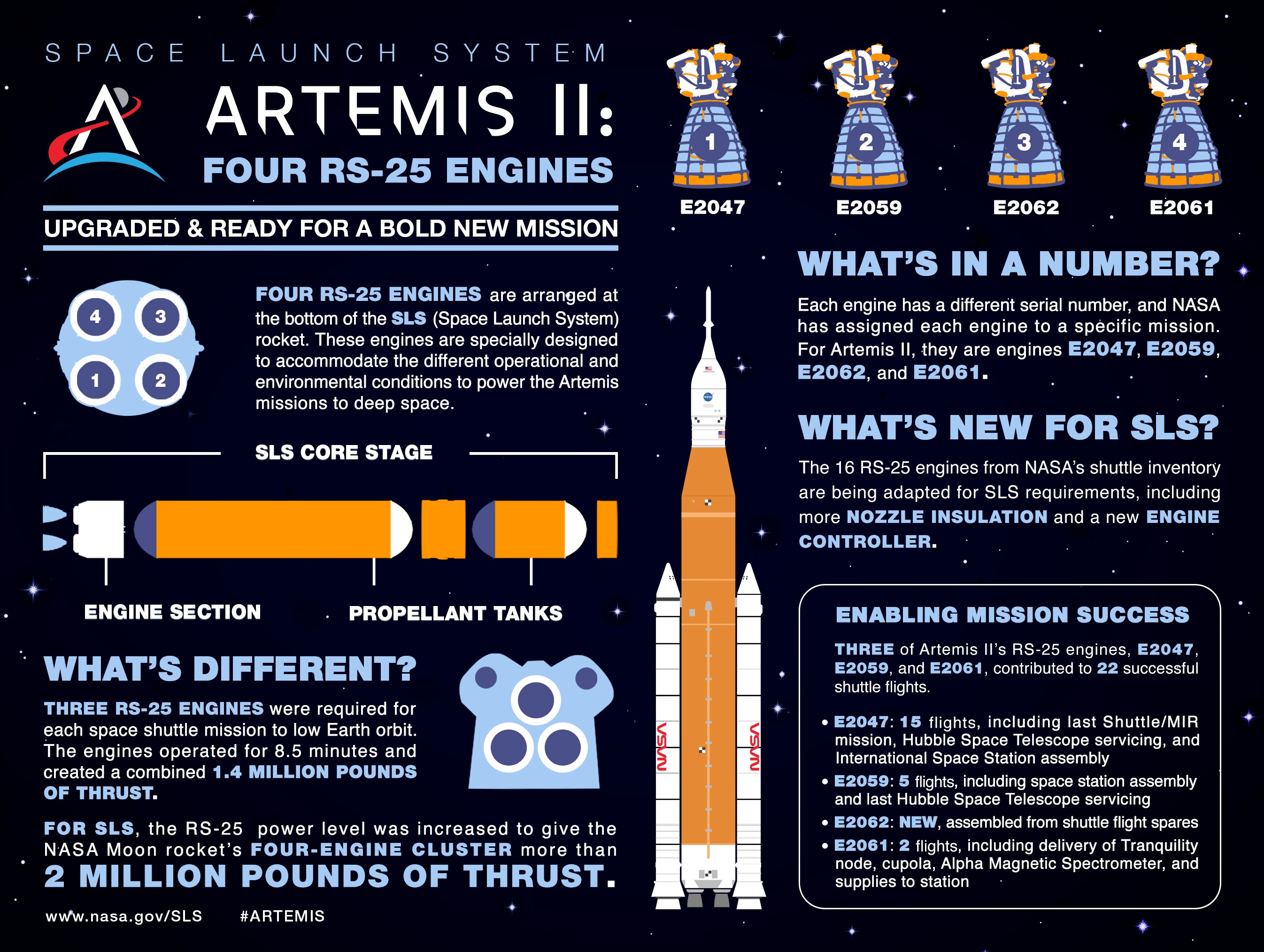 This infographic depicts the four RS-25 engines that are situated on NASA’s Space Launch System rocket for the Artemis II mission. Credit: NASA/Kevin O'Brien
